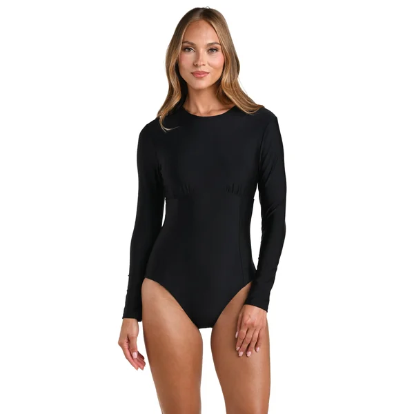 Lambert paddlesuit features a high neckline, long sleeves, and a zipper back with gold-plated logo zipper. pull. Offers supportive underwire with removable soft cups, all over shaping, and moderate bottom coverage.
