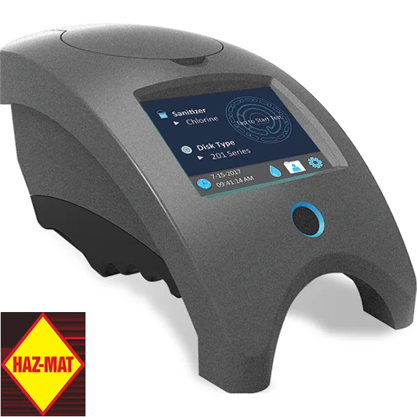 LaMotte WaterLink® Spin Touch™ #3581 is a simple-to-use, portable photometer designed for commercial pools. It can communicate through Bluetooth® with a smartphone or tablet device, or it can be used as a standalone device with results shown on the touch screen. Pool or spa water is added into a unique WaterLink® Spin reagent disk (disks sold separately), then the disk is placed into the WaterLink® Spin Touch™ photometer. In just 60 seconds all tests are completed. Each sealed reagent disk contains the precise amount of reagents needed to run a complete series of tests. Includes photometer, USB cable/wall adaptor to charge the internal battery, disk shield, meter check disk, three syringes, instruction manual and a durable, waterproof carrying case.