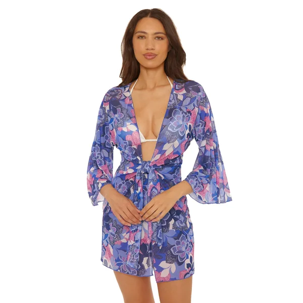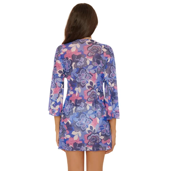 Kimono features floral print, three quarter sleeves, and a tie front closure.