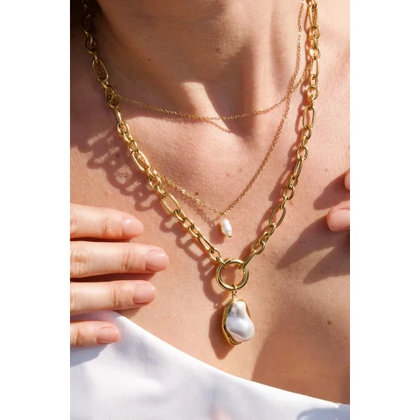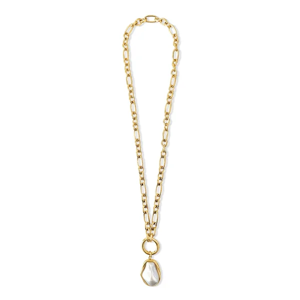 Langston necklace features hypoallergenic gold plated stainless steel, a faux pearl pendant, and a clasp closure.