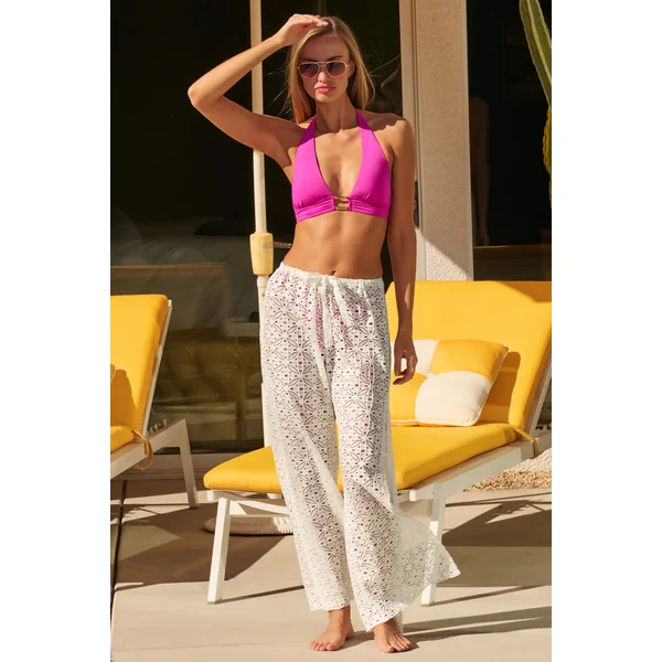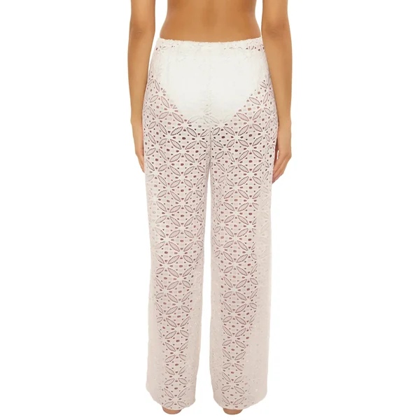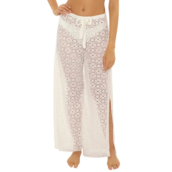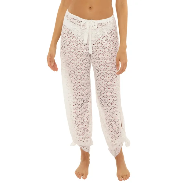 Lace crochet pants feature a drawstring waistband, and can be worn with a wide leg or tied at the angle for a harem style.