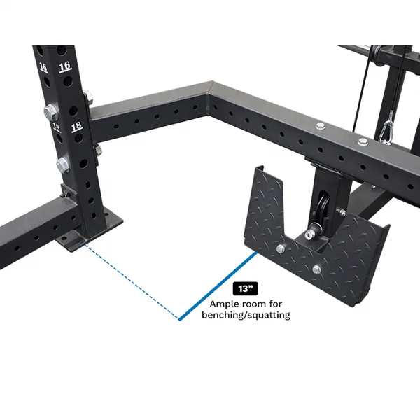 The lower footplate of the HL-PL-1000 is designed to be 13″ away from the uprights to allow for ample space for placement of your bench when you’re benching off the attached uprights, as well as plenty of space for your feet when using the uprights as a squat rack.