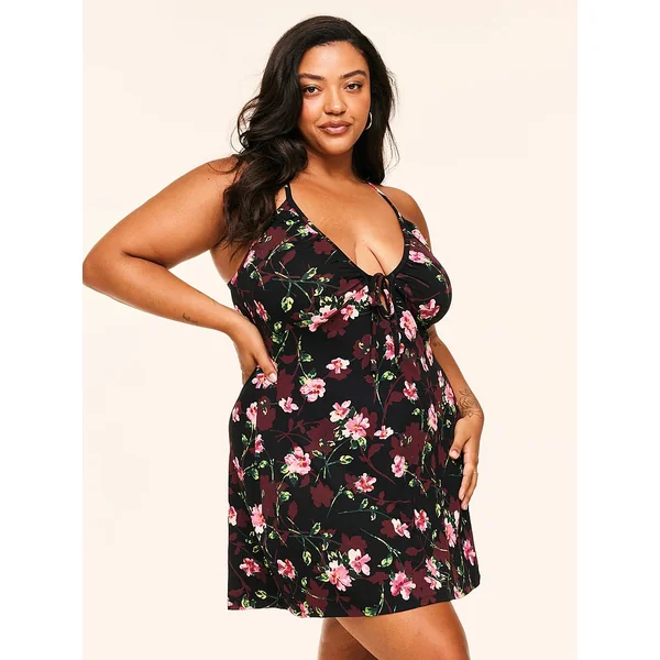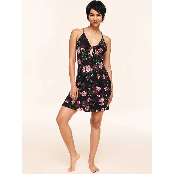 The perfect balance of comfort and style, this soft, easy style features ruching details, a plunging neckline, and an adjustable front keyhole.
