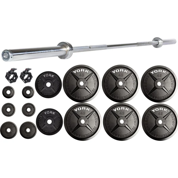 The York Barbell 7’ Elite Power Bar featured in the 181 kg set is made from high-quality North American steel. This bar has a 1500lb weight limit, 29mm bar diameter, and 16” loadable sleeves. It is a rigid bar that is excellent for performing static, highly controlled, slow movements such as the squat, chest press, and deadlift.