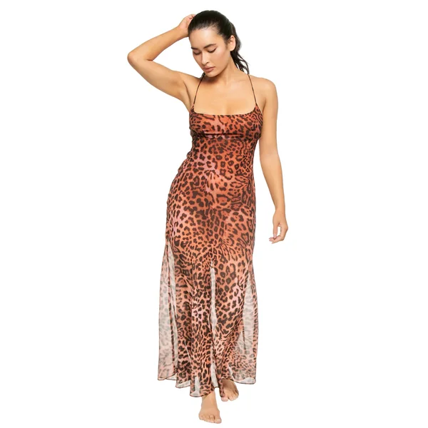 Chiffon maxi dress features animal print, a square neckline, and lace-up back ties. Mini lining attached for added coverage.