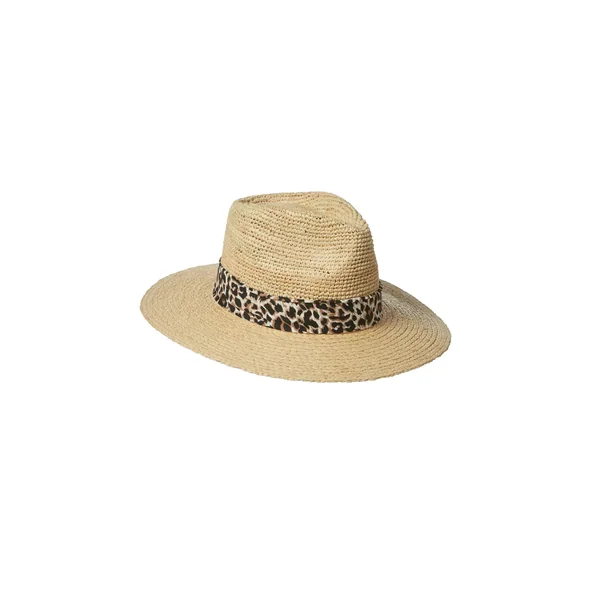 Leopard Panama hat features a ribbon detail around the base. Offers an adjuster on the hat’s interior.