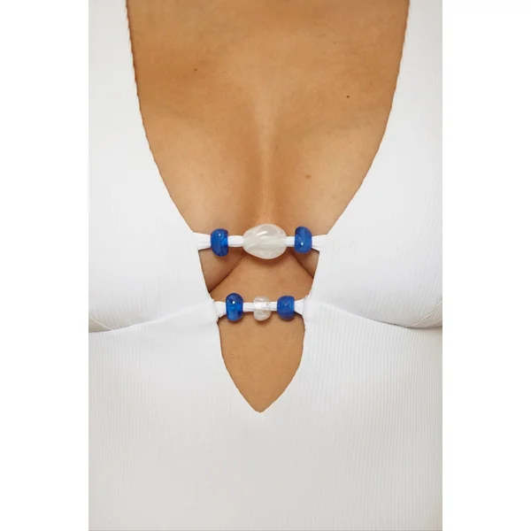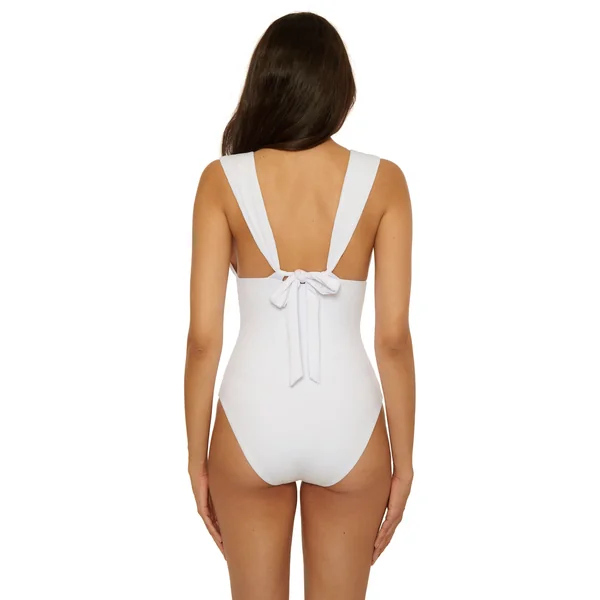 Ribbed one piece swimsuit features a plunge neckline accented with marbleized beads. Offers removable soft cups and sash-style adjustable straps that tie in the back.