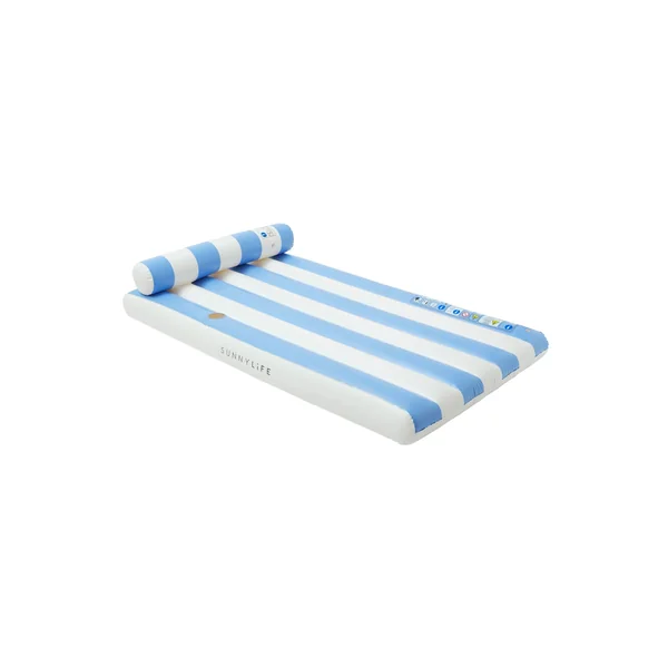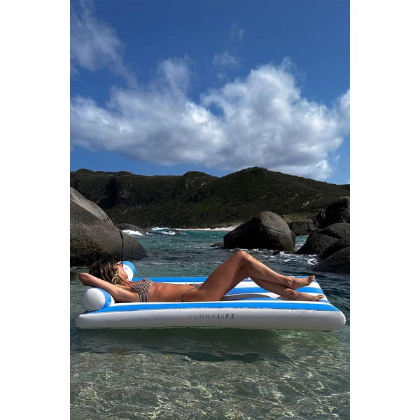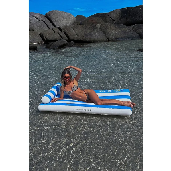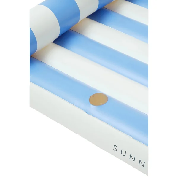 Lilo pool float features striped durable non-toxic PVC, a headrest for extra support, and cup holder. Offers a repair patch incase of punctures.