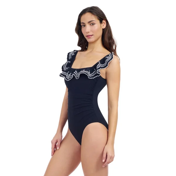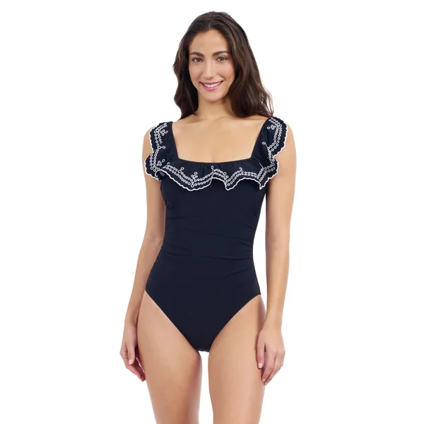 One piece swimsuit features a square neckline with embroidered ruffle trim. Offers adjustable straps, soft cups, and moderate bottom coverage.
