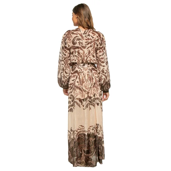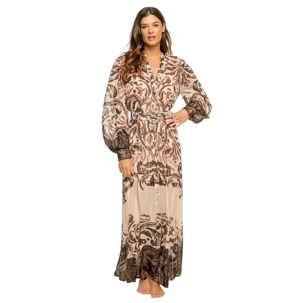 Maxi dress features a button-down front, sheer long sleeves with gathered cuffs, and a removable belt.