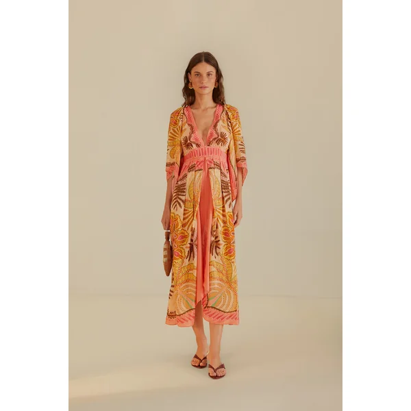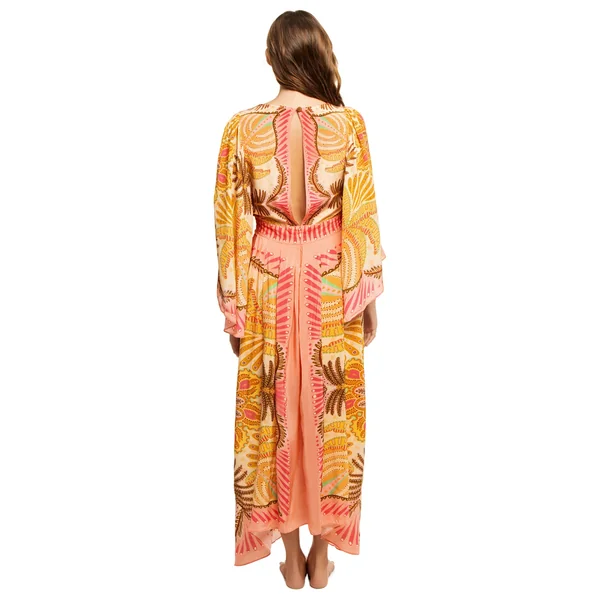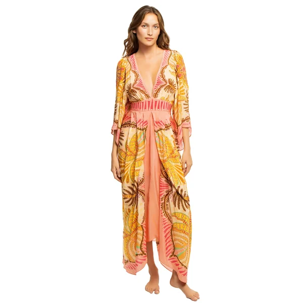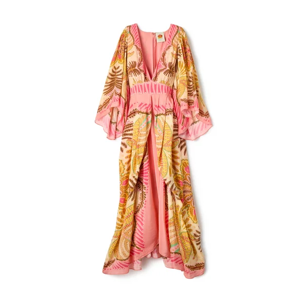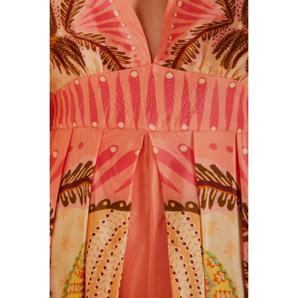 Maxi dress features a plunging neckline and empire waist. Offers a zipper closure and top button at back.