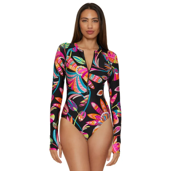Paddle suit features floral print and long sleeves with thumbholes. Offers a front half zipper and moderate bottom coverage.