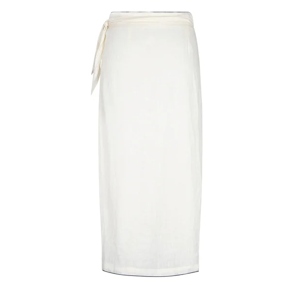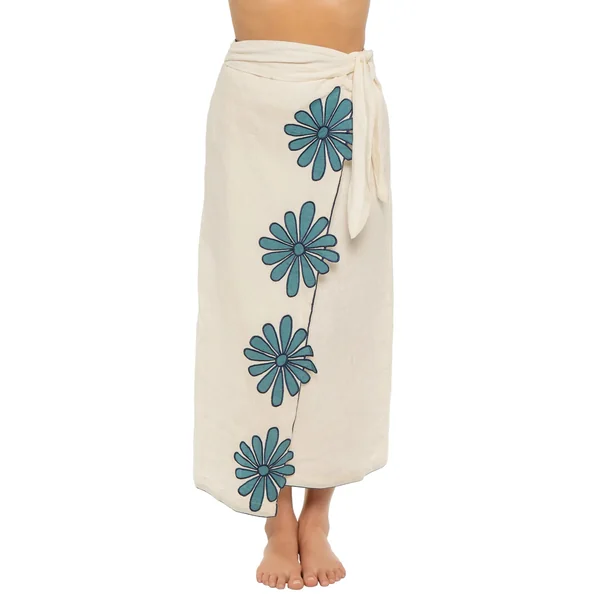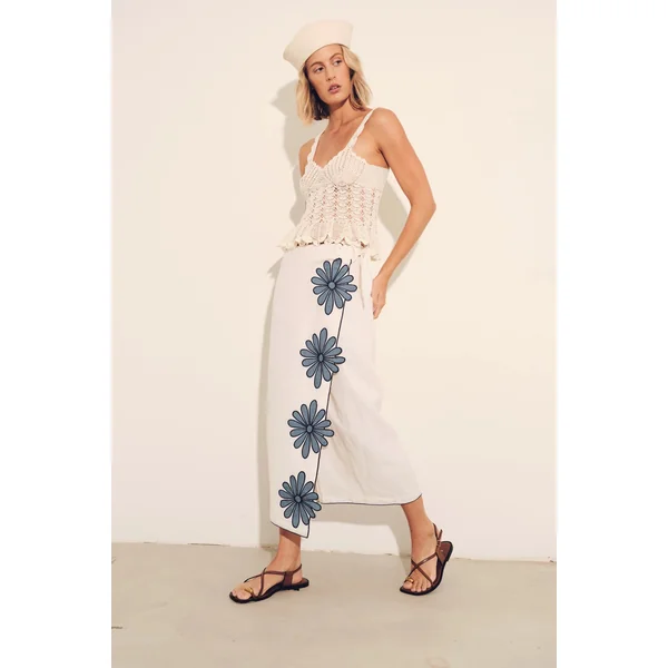 Skirt features a wrap design with side self-tie, artisanal hand-cut appliqué flower detailing, and a straight hem.