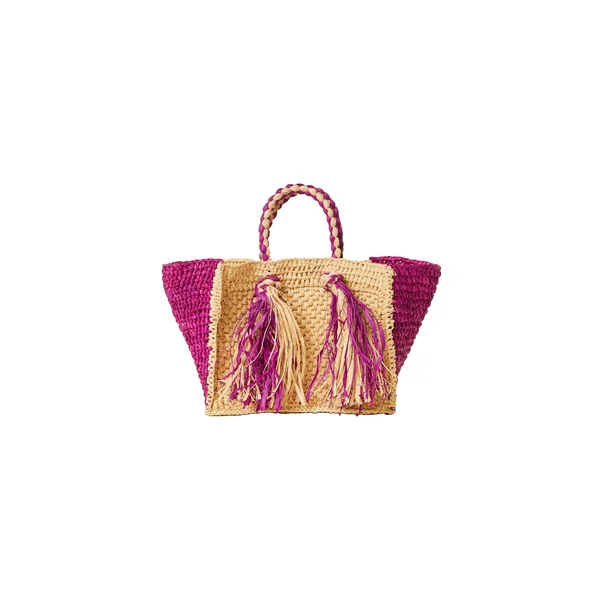 Lucas tote bag features woven raffia and tassel details.