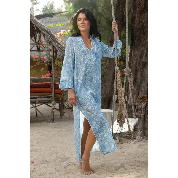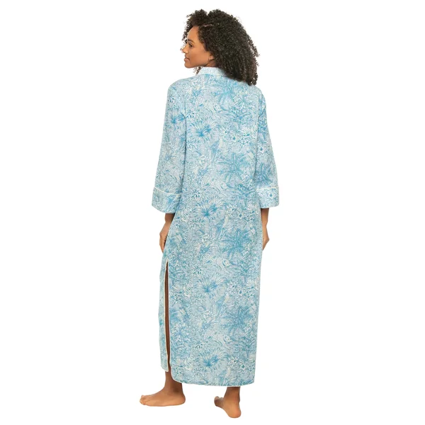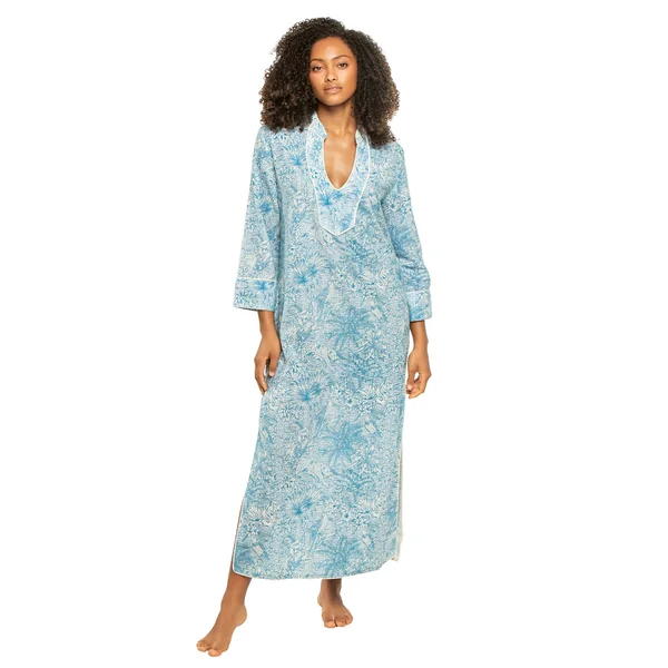 Lulu lightweight cotton maxi dress features a bold jungle print, v-neckline. contrast stitching trims then neckline, the sleeve cuffs and the hem, long sleeves, and a side leg slit.