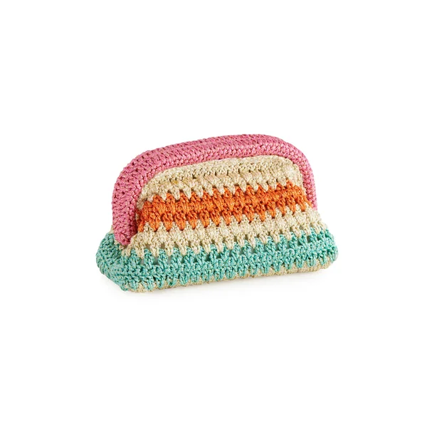 Lunda clutch features a multicolored crochet design.