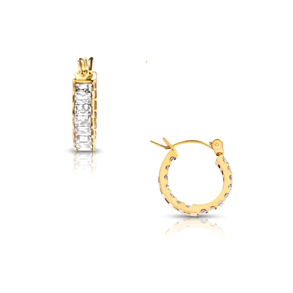 Lyndsay Huggie hoop earrings are water-resistant, made from gold-plated stainless steel, and feature cubic zirconia. Offers snap back closure.