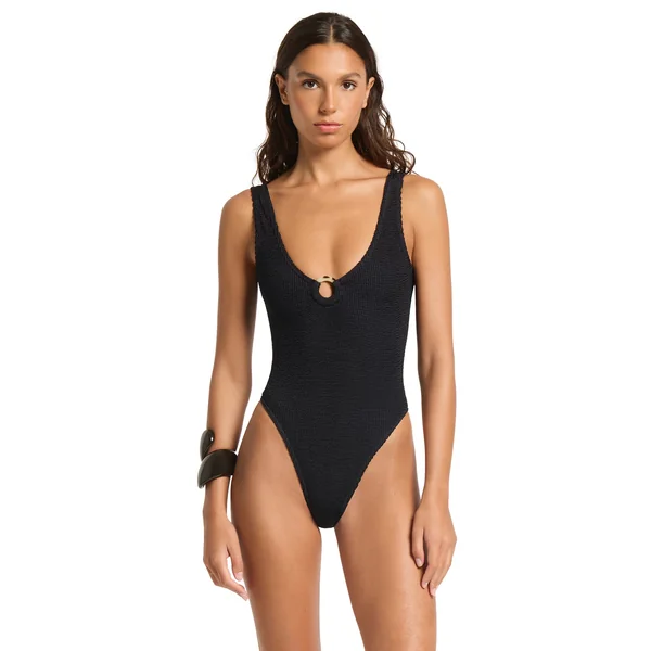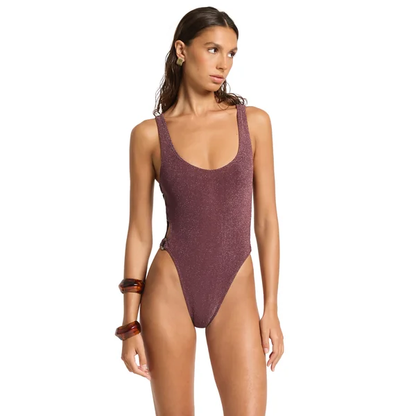 Madison one piece swimsuit features crinkle stretch shimmer fabric, scoop neckline with tortoise ring at center. Offers a high leg design and minimal bottom coverage.