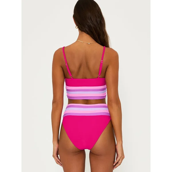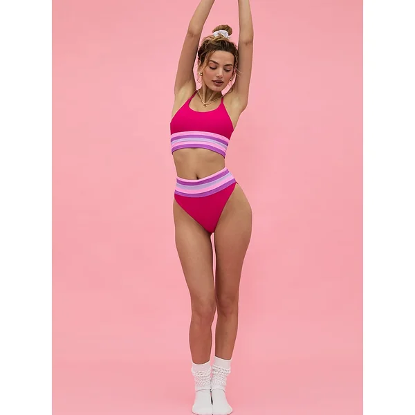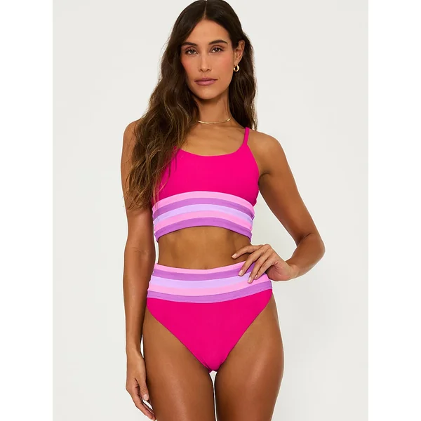 Cool color blocking details add a retro feel to this longline style that features a flattering scooped neckline. Pair with the Millie Bottom for the full look.