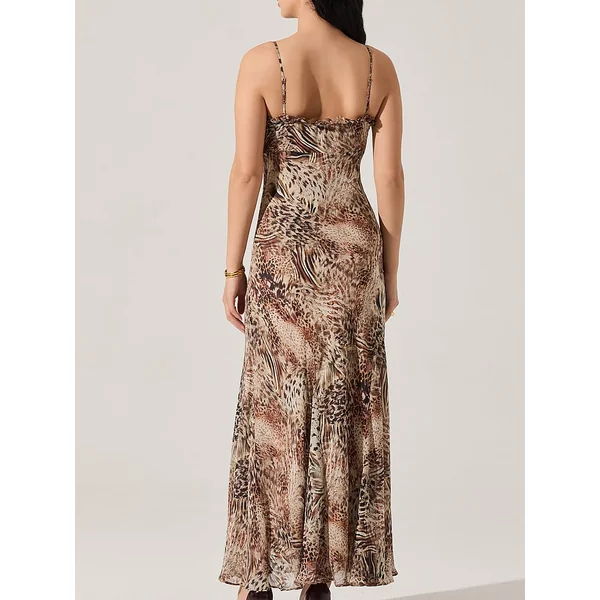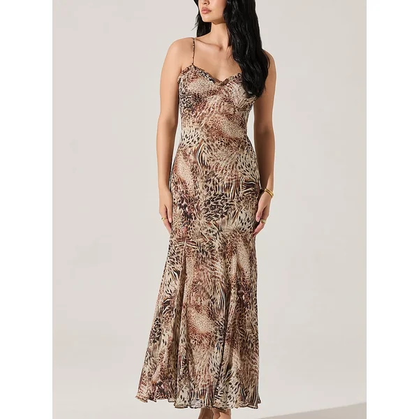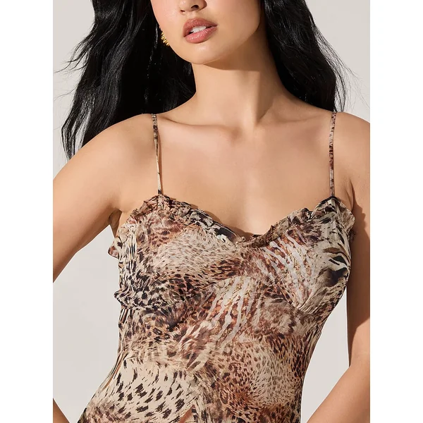 Bold romance. Adorned in a contrasting, animal-print pattern, a sweetheart neckline with ruffle trim adds a flirty feel to this slip-style Dress.