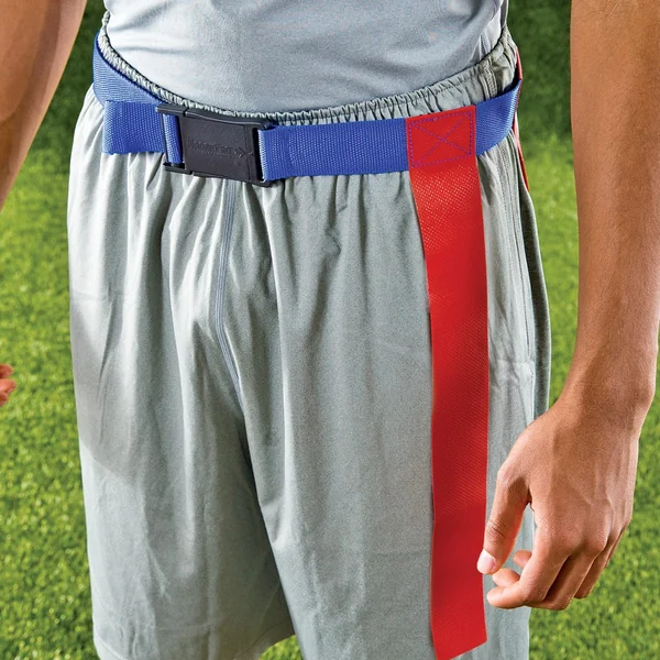 This is a belt release design, meaning the entire belt comes off the student or player when flags are pulled.