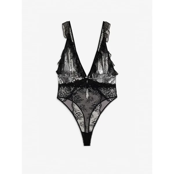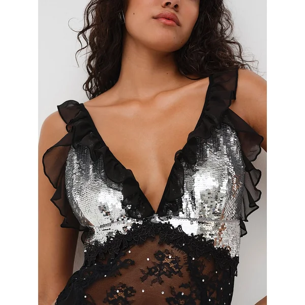 Tis the season to enchant in a shimmering bodysuit with sequin cups that evokes the sparkle of ice in the moonlight. A sultry plunging V-neckline, soft chiffon ruffles, and intricate lace accents are the perfect finishing touches.