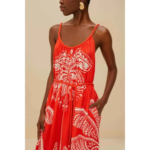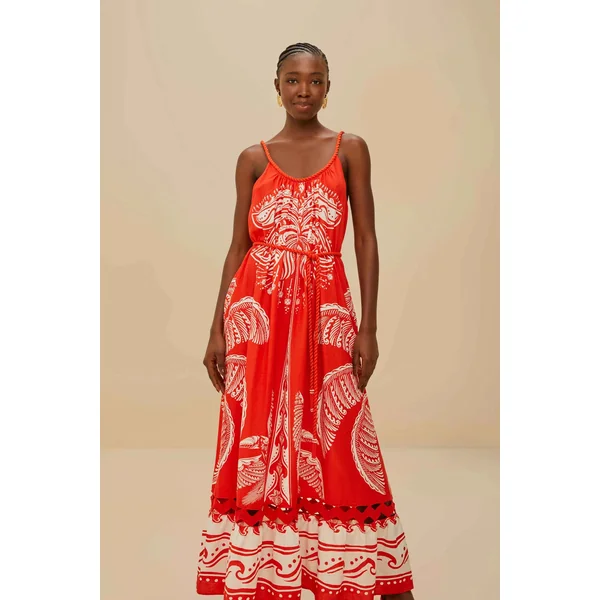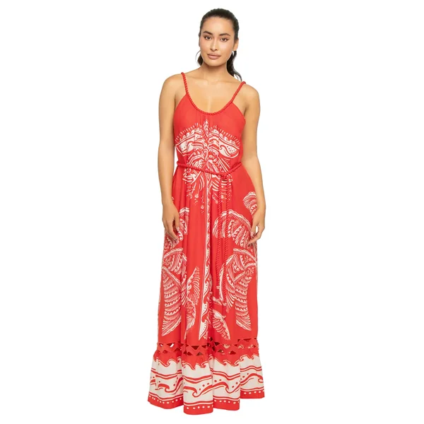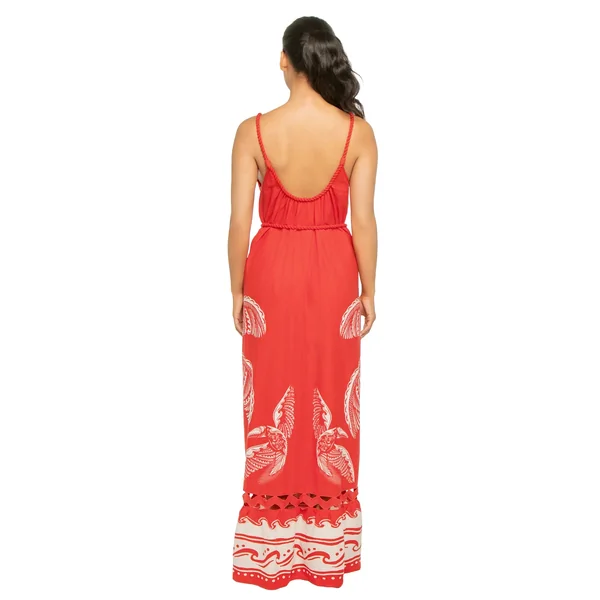 Linen blend maxi dress features tropical print, braided straps, and a ruffle hem with cutouts. Offers a removable braided waist tie adorned with beaded tassels.