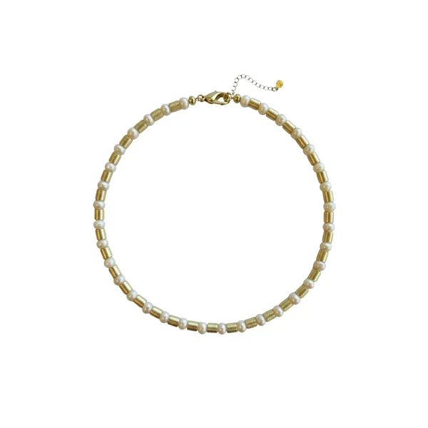 Necklace features freshwater pearl rondelles, gold plated brass barrel beads, and a lobster clasp closure.