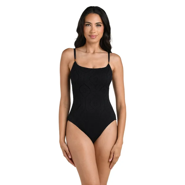 One piece swimsuit features a lace-inspired pattern with geometric and floral motifs woven into the jacquard fabric. Offers adjustable straps adorned with silver tube beads and moderate bottom coverage.