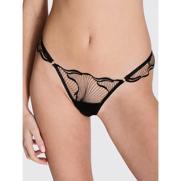 Delicate, artful embroidery and scalloped edging. This sheer thong features a unique triangle keyhole detail and a gentle bamboo gusset that combines style with comfort.