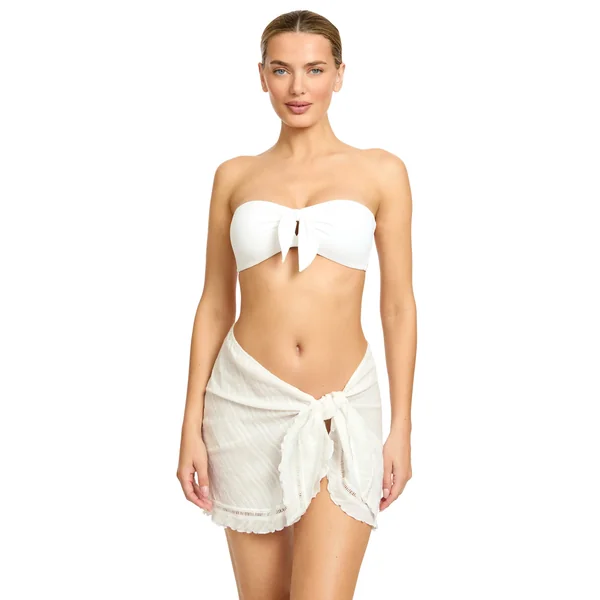 Marina self tie pareo features lattice trim and ruffle hem.