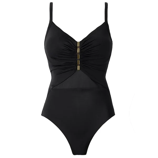 Slimming and sexy, this One-Piece bathing suit has an underwire bra for support, v-neckline, and adjustable lingerie straps for the ideal fit. A center-front hardware detail adds an hourglass effect.