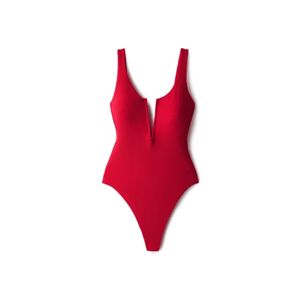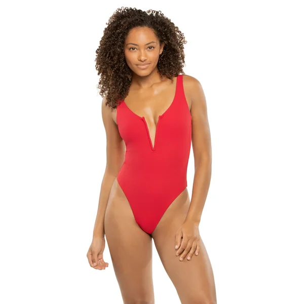 Martinique ribbed one piece features plunge front v-wire and scoop back. Offers skimpy bottom coverage and a high leg cut.