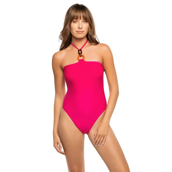 May one piece swimsuit features adjustable halter strap and ring accent. Offers moderate bottom coverage and a high-leg design.