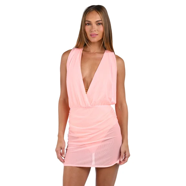 Mesh mini dress features a plunging neckline, cinched waist and ruching.