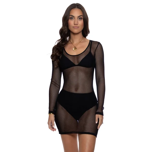 Mini dress features open-weave mesh fabric, scoop neckline, and long sleeves.