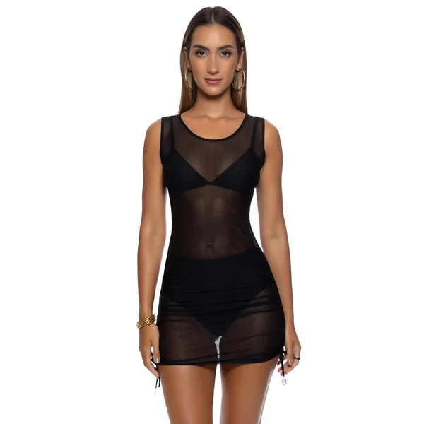 Sleeveless mesh mini dress features a scoop neck and offers adjustable shirring at the sides.