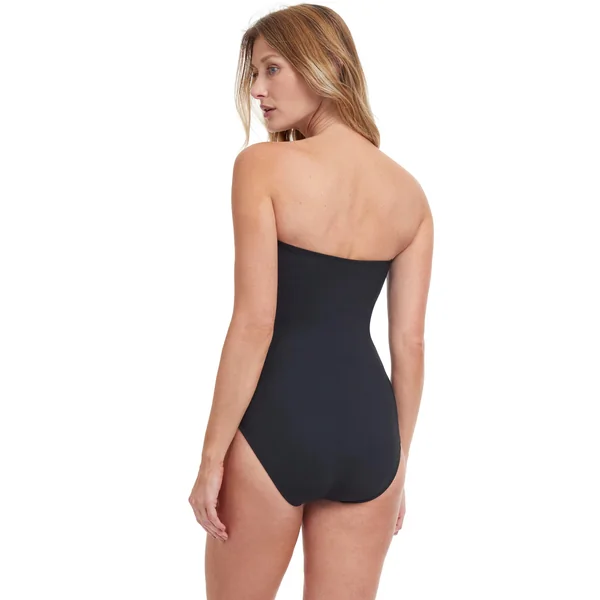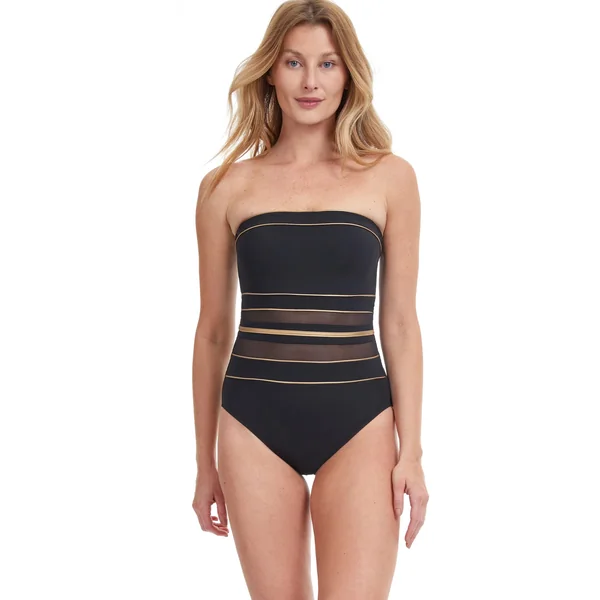 One piece swimsuit features a bandeau neckline. metallic piping and mesh insets. Offers soft cups, adjustable removable straps, tummy control, and full coverage.