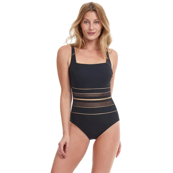 One piece swimsuit features a square neckline. metallic piping and mesh insets. Offers soft cups, adjustable straps, tummy control, and full coverage.
