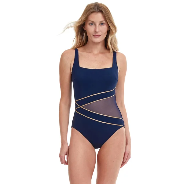One piece swimsuit features metallic striping and mesh insets. Offers soft cups, tummy control and full bottom coverage.