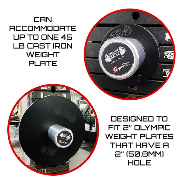 This Micro Gainz GymPin is designed to be used with 2″ Olympic plates that have a 2″ (50.8mm) hole in the middle