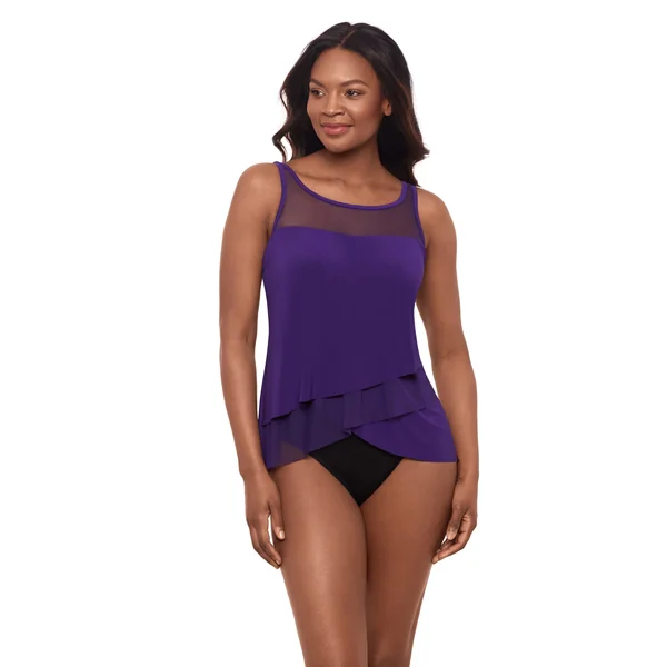 Mirage tankini top features an illusion mesh neckline, underwire bra, front draping to conceal tummy, and adjustable straps.