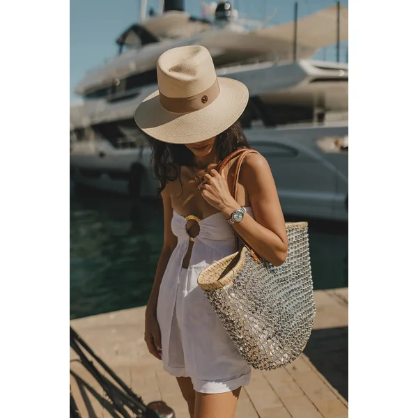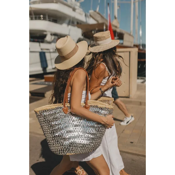 Mirage tote sparkles with shimmer sequins, featuring double leather straps for effortless carrying and a secure metal button closure.