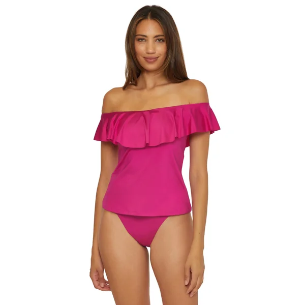 Monaco bandeau tankini top features an off-the-shoulder ruffle neckline and removable cups.