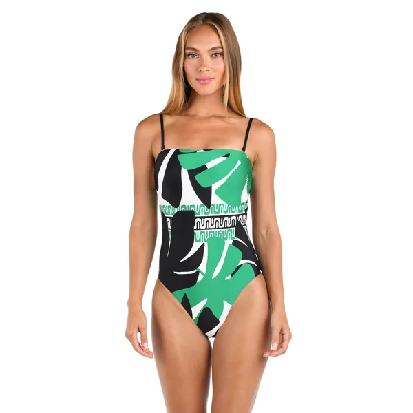Bandeau one piece features oversized tropical leaf pattern, tummy control and lace-up back. Offers molded cups, adjustable removable straps, and moderate bottom coverage.