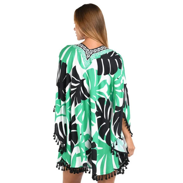 Monstera kimono features oversized tropical leaf pattern, butterfly sleeves and thread tassel trim.