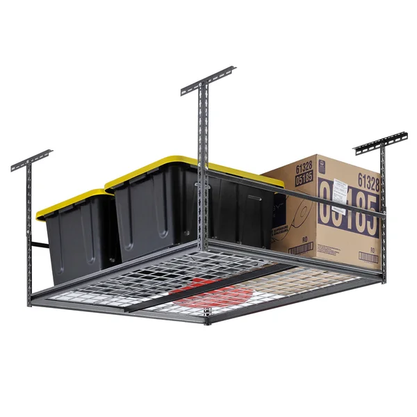 The ceiling storage rack features an adjustable wire shelf that ranges from 15-3/8″ to 28″H in 1″ increments to create a storage space that suits your specific needs. The shelf supports up to 300 lb, thanks to the sturdy powder-coated steel frame and strong wire decking. The wire design enhances visibility from underneath for easy access to supplies. It also increases airflow, minimizing dust collection and odor. Mounting hardware and installation instructions included. Minimal assembly required. 47″L x 47″W x 28″H; 37 lb.