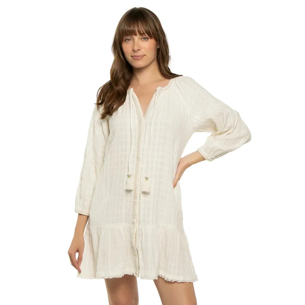 Mini dress features soft cotton gauze fabric, a split neck offers ties adorned with tassel details and a dainty single-tiered hem trimmed with fringe.