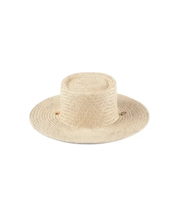 Nat panama hat features a braided raffia fabrication with a wide decorative band.