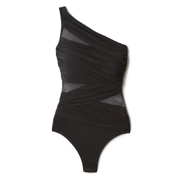 Network Jena asymmetrical one piece with shelf bra, wrapped fabric detailing, and mesh cut outs.